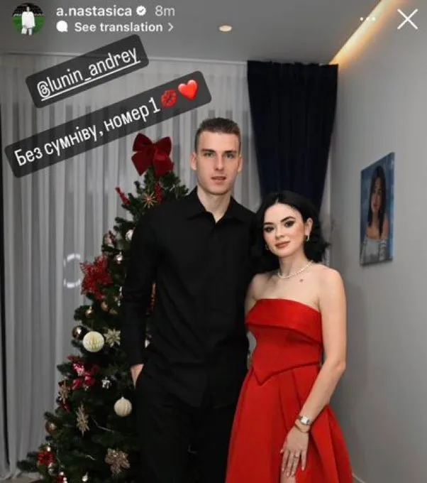 Дружина Луніна Анастасія підтримала свого чоловіка. Вона опублікувала в сторіз спільну фотографію з Андрієм та зробила відповідний підпис, хто повинен захищати ворота Реалу.