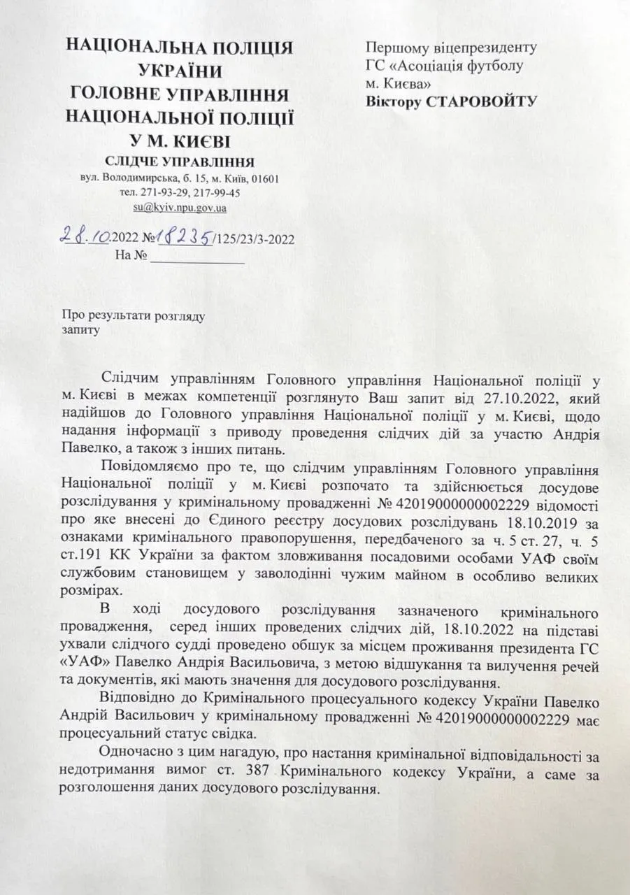 Обшук було проведено 18 жовтня на підставі ухвали слідчого судді за місцем проживання Павелка з метою відшукання та вилучення речей і документів, які мають значення для досудового розслідування кримінального провадження за фактом зловживання посадовими особами УАФ своїм становищем у заволодінні чужим майном в особливо великих розмірах.