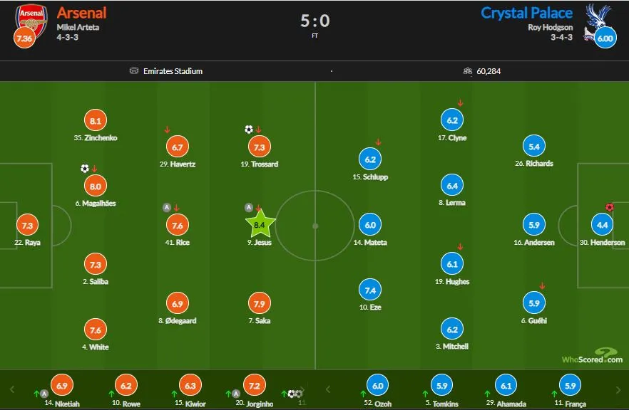 Оцінки гравців у матчі Арсенал – Крістал Пелас / WhoScored