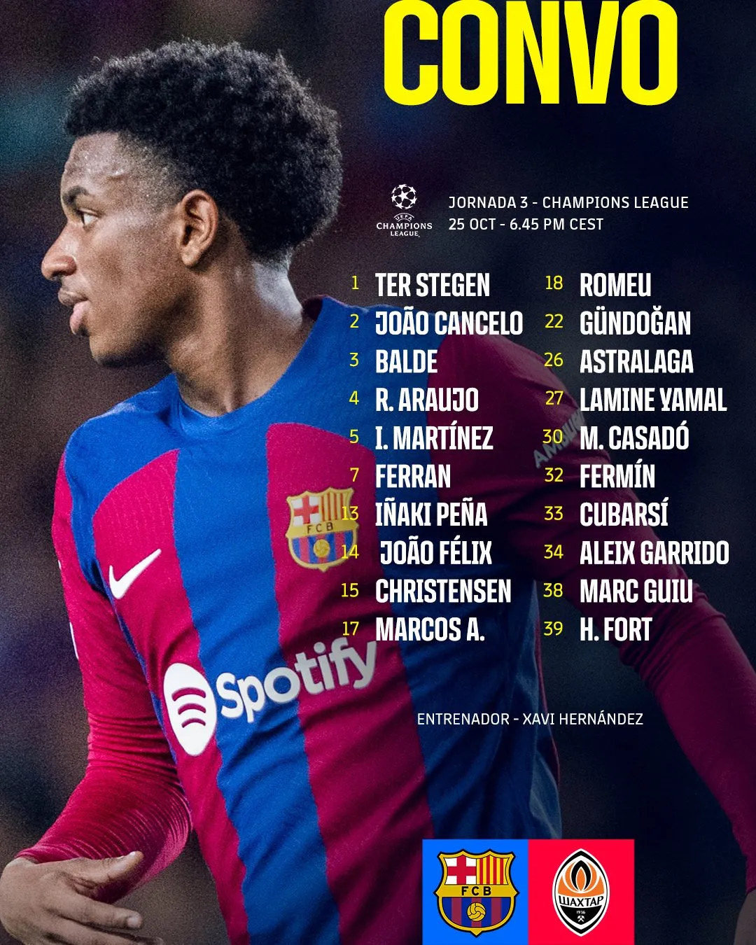 Тренерський штаб каталонської Барселони визначився із переліком гравців, які потрапили в заявку на матч проти Шахтаря. Через травми Хаві не зможе розраховувати на 6 виконавців: Сержі Роберто, Жюль Кунде, Френкі де Йонг, Педрі, Рафінья та Роберт Левандовський. Крім того, не допоможе своїй команді 19-річний хавбек Гаві, який відбуває дискваліфікацію.