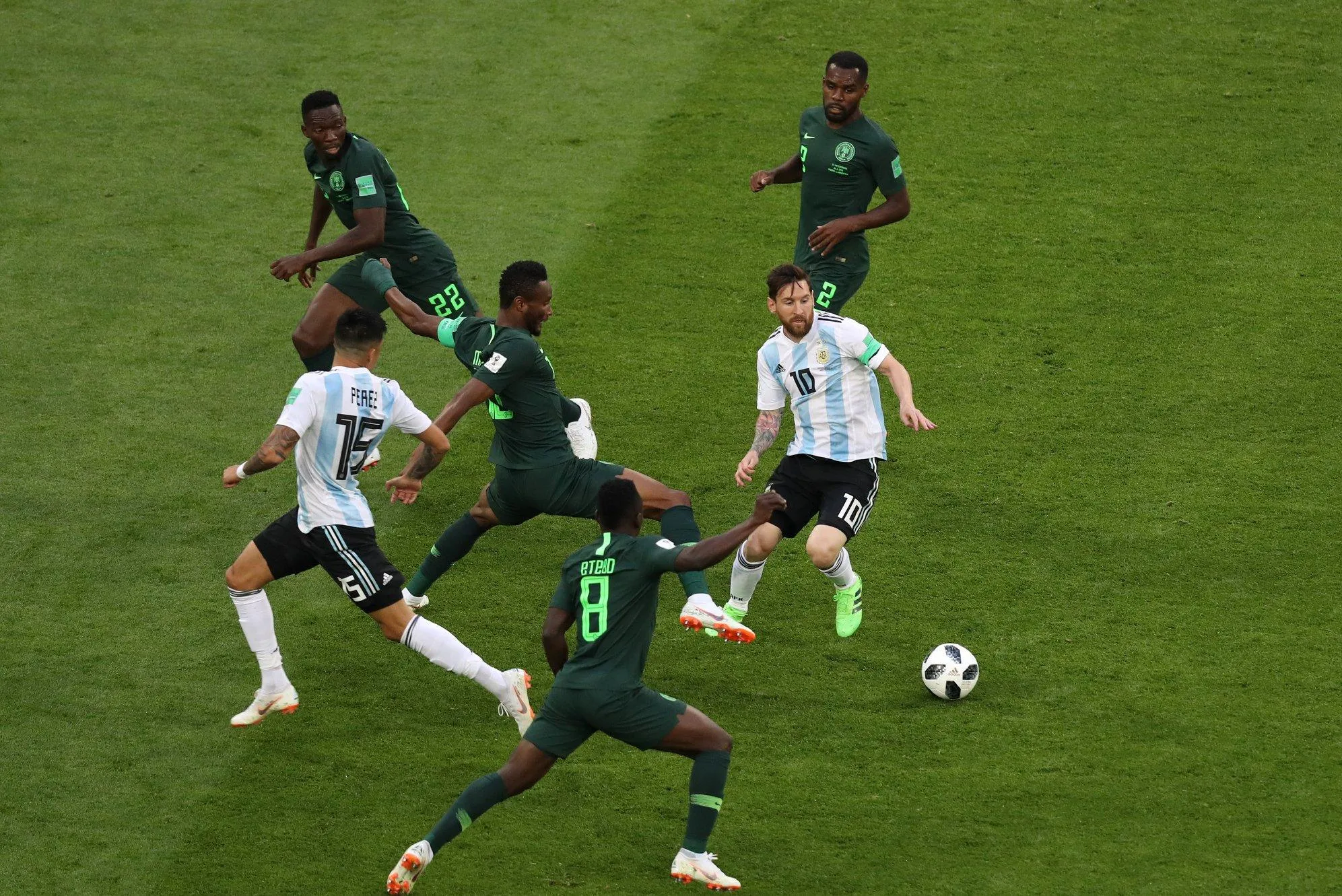 Джон Обі Мікел (у центрі) у матчі проти Аргентини на Чемпіонаті світу