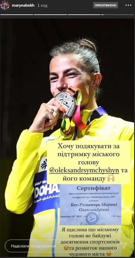 Про подарунок розповіла сама Марина Бех-Романчук у своєму Instagram-акаунті. 25-річна легкоатлетка виклала сторіс із подякою для мера міста Хмельницького Олександра Симчишина.
