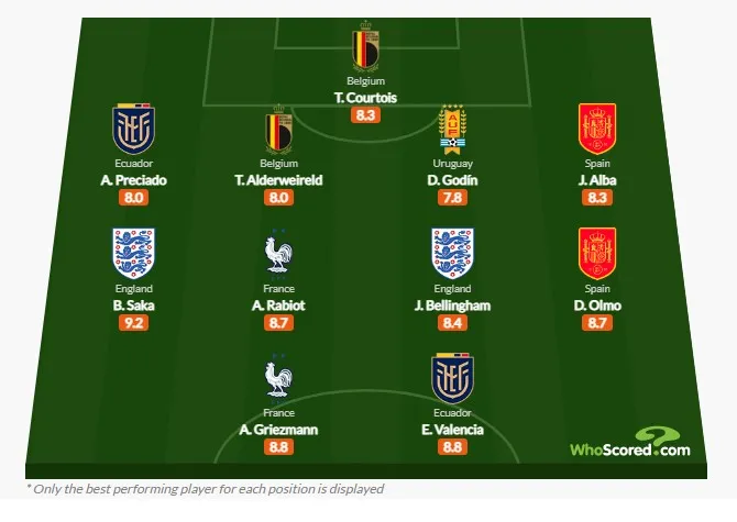 Букайо Сака зі збірної Англії отримав найвищу оцінку серед всіх гравців – 9,2. І він розмістився на правому фланзі півзахисту. А в центрі півзахисту – його партнер Джуд Беллінгем, який першим відзначився у матчі проти збірної Ірану.