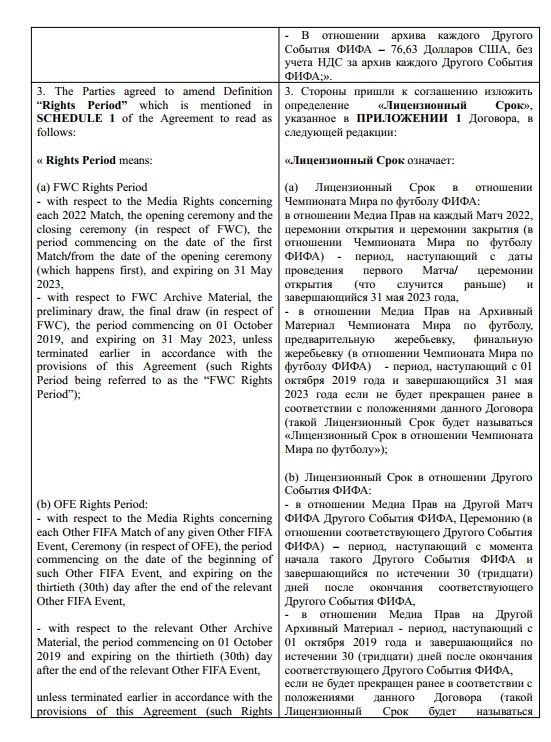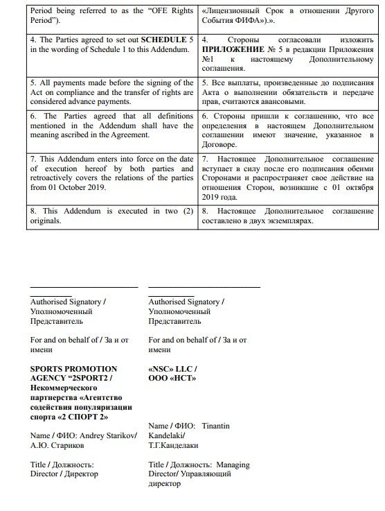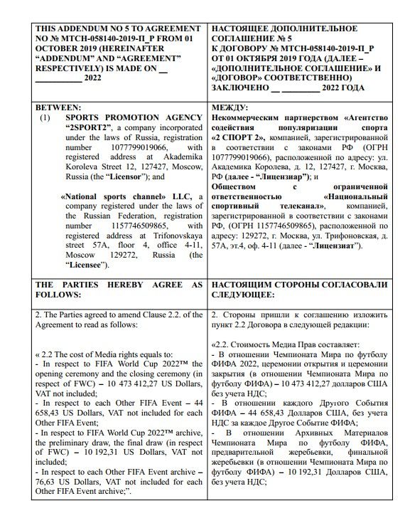Крім того, в окремому договорі між ФІФА та "2 Спорт 2" є цікавий пункт про оплату прав на трансляцію, адже всі необхідні платежі треба було здійснити до 1 вересня 2022 року. Водночас для російської сторони, зокрема й для каналу Канделакі "Національний спортивний телеканал" пропонують виняток – провести оплату протягом 10 робочих днів з моменту підписання угоди.