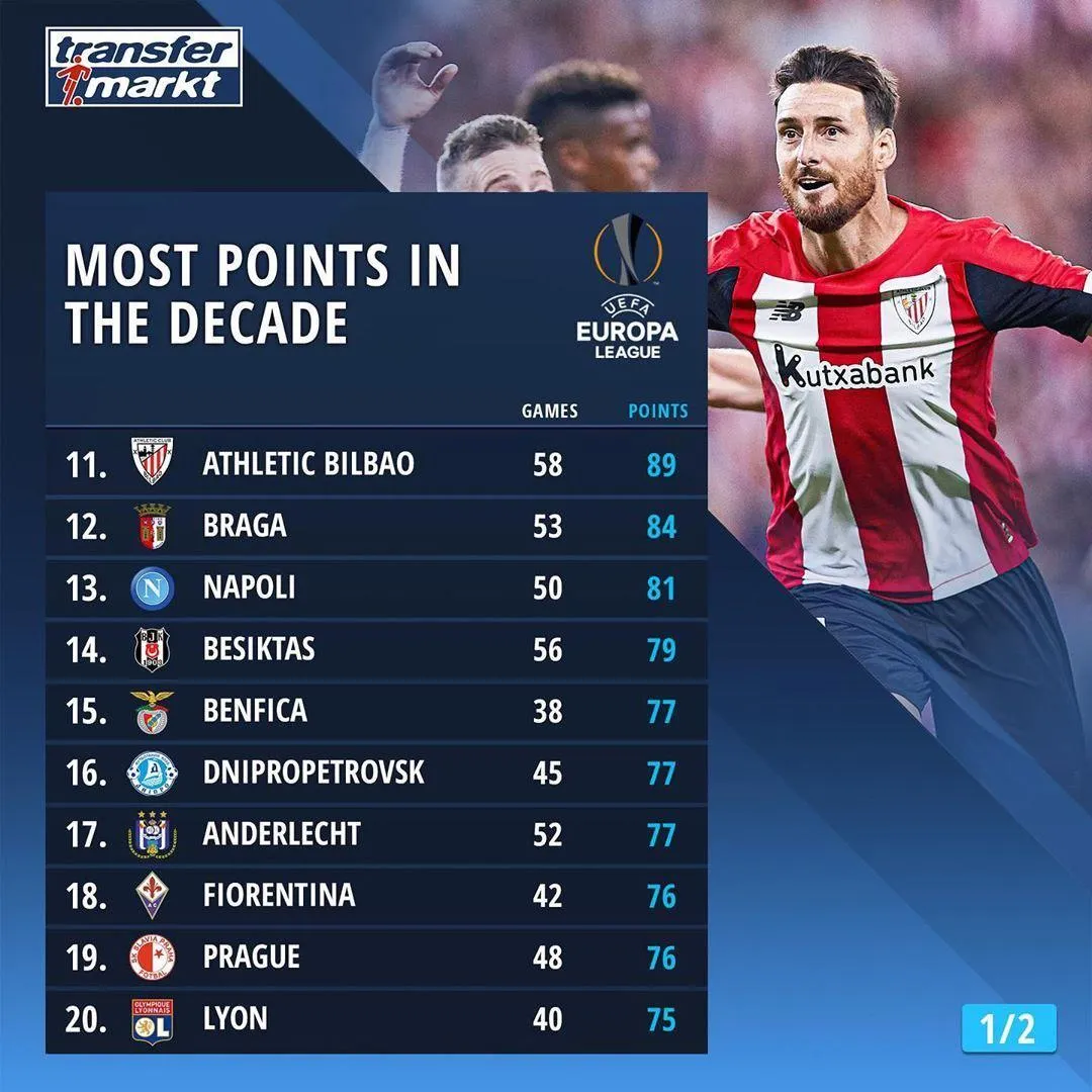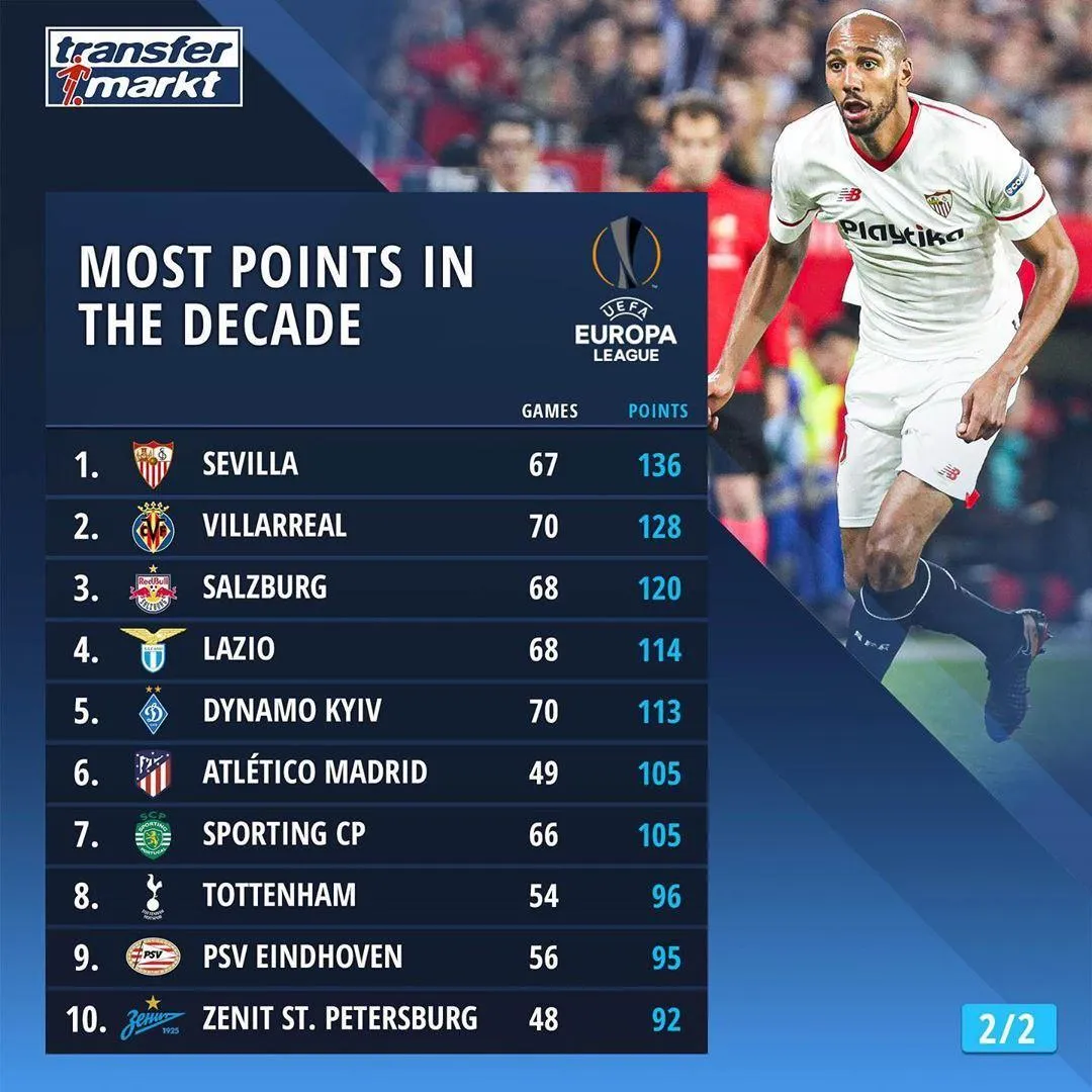 Найкращою командою Ліги Європи за набраними очками за останні 10 років є іспанська "Севілья". Вона 5 разів вигравала турнір. У команди 136 очок за 67 матчів.