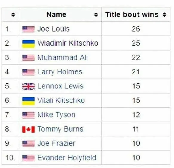 Віталій Кличко у такому рейтингу йде на 6-й позиції. За свою кар'єру провів 15 успішних титульних боїв. Така ж кількість вдалих протистоянь є у доробку британця Леннокса Льюїса.
