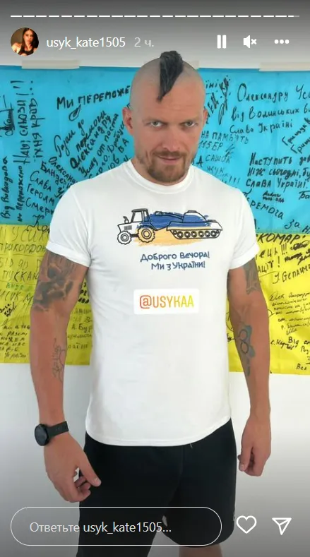 Нещодавно іменитий боксер повернув собі патріотичну зачіску. Він сфотографувався у футболці з уже крилатим висловом "Доброго вечора, ми з України".