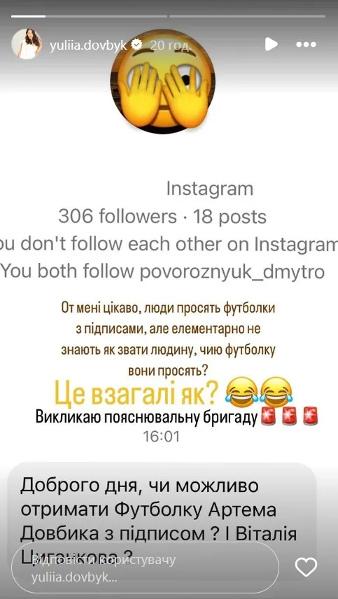 "От мені цікаво, люди просять футболки з підписами, але банально не знають як звати людину, чию футболку вони просять? Це взагалі як? Викликаю пояснювальну бригаду", – написала Юлія і своєму інстаграмі.