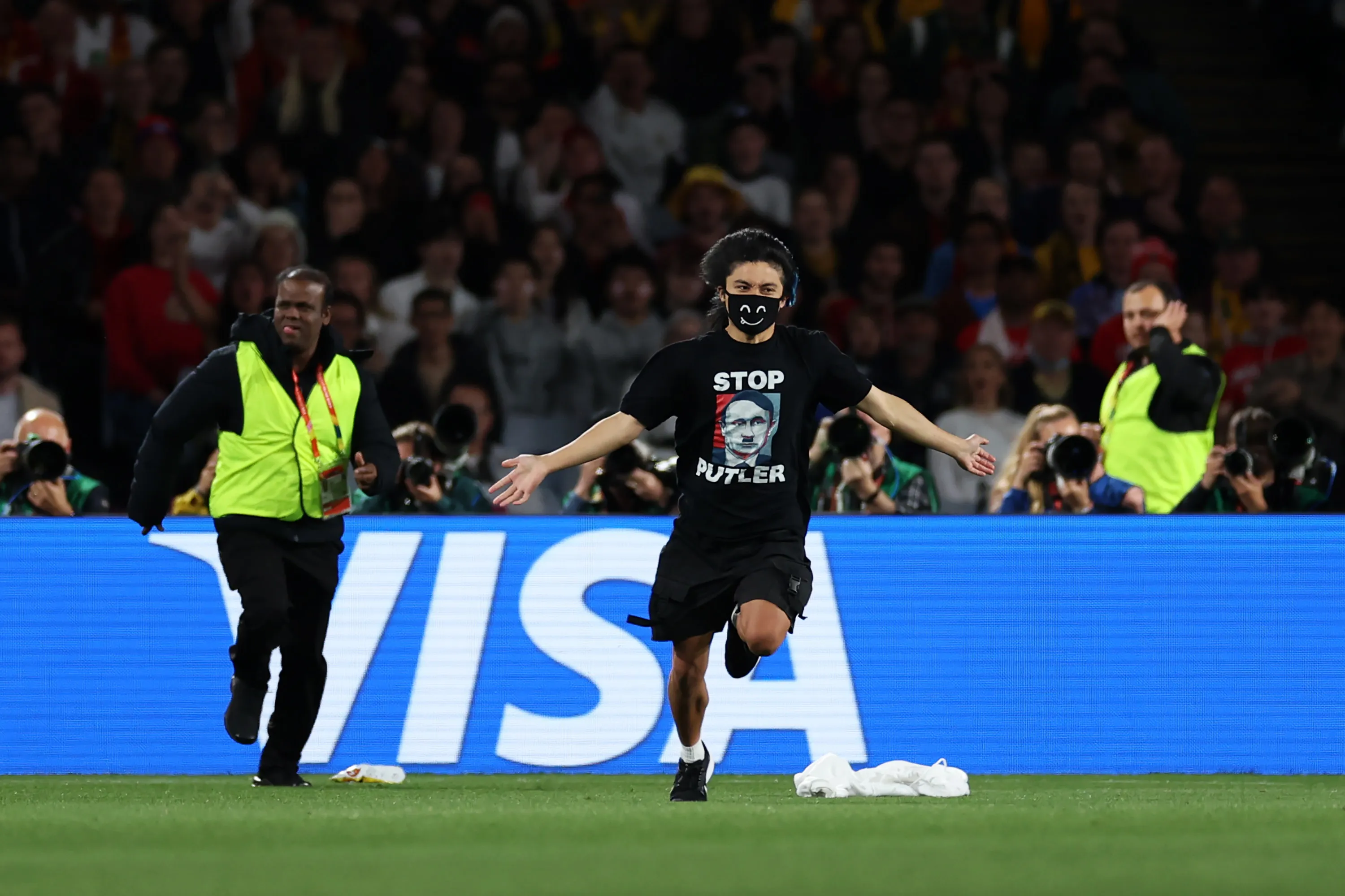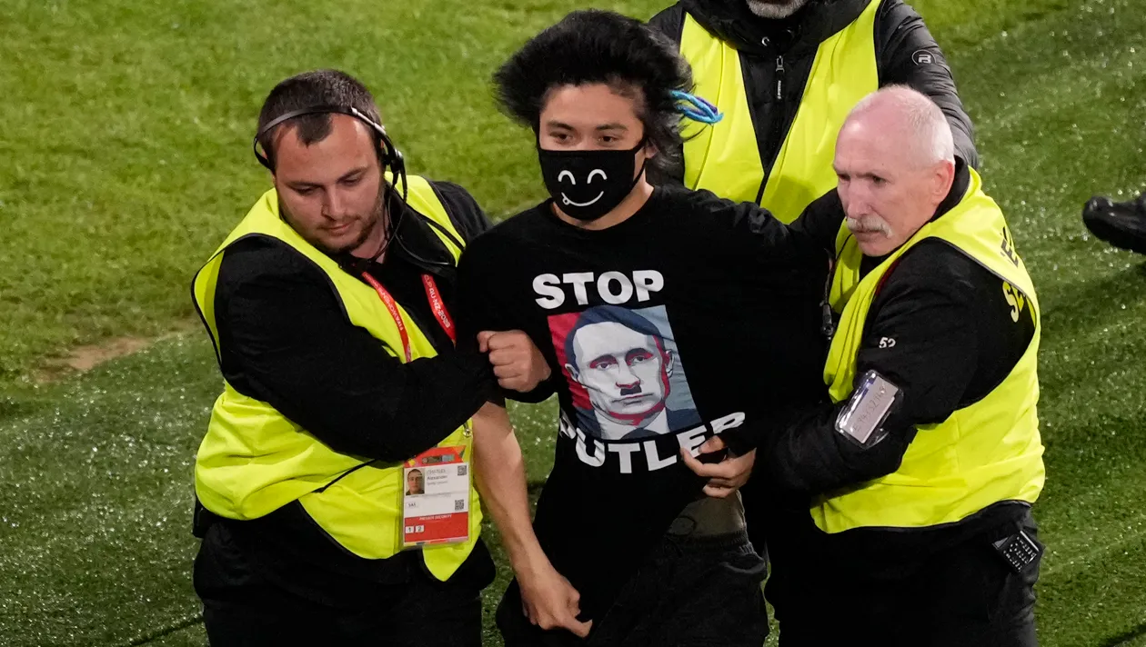 На 26-й хвилині матчу невідомий уболівальник у масці привернув до себе увагу своїм сміливим вчинком. На передній частині футболки був зображений міжнародний злочинець Владімір Путін стилізований під нацистського лідера Адольфа Гітлера. Напис красномовно повідомляв світу: "Stop Putler" (Зупиніть Путлера). На спині було написано: "Звільніть Україну".