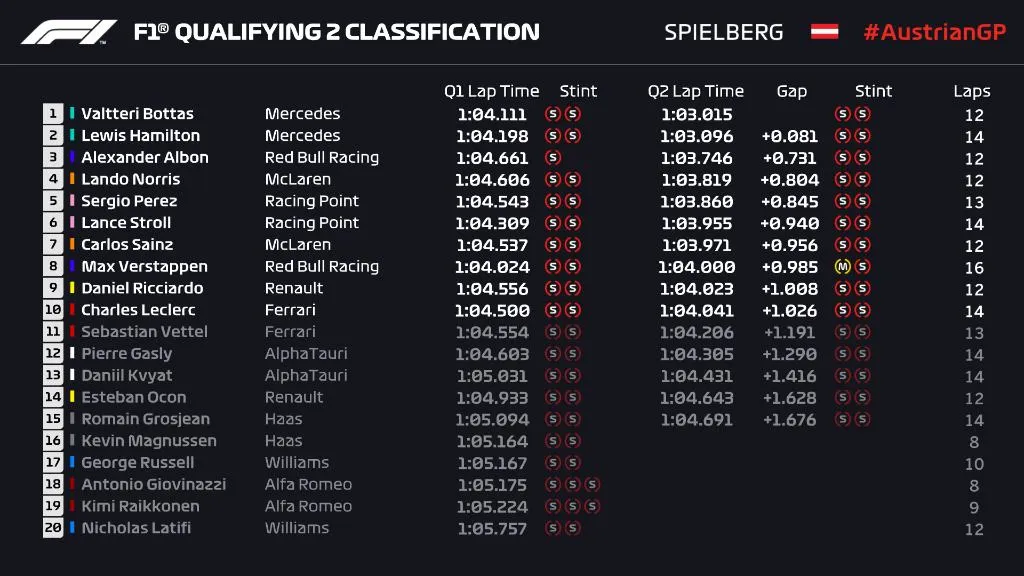 Перемогу у кваліфікації гран-прі Австрії здобув фінський гонщик Валттері Боттас. Про це повідомляє 24 канал. Другим час продемонстрував Льюїс Хемілтон (Mercedes), а третій – Макс Ферстаппен (Red Bull).