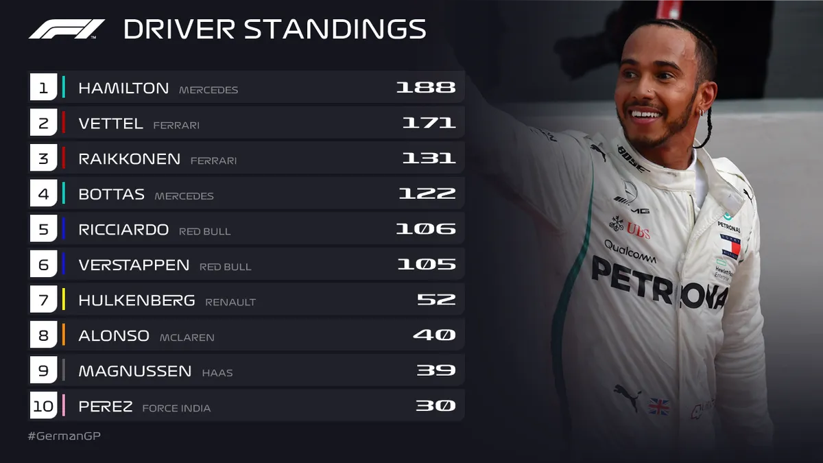 Після цієї гонки Хемілтон знову очолив загальний рейтинг, обійшовши Феттеля.