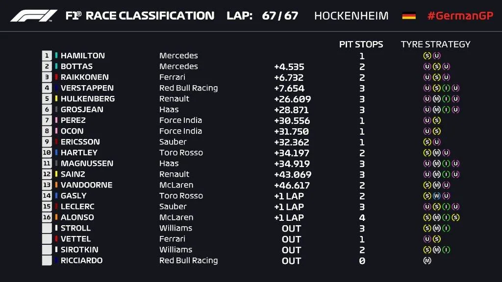 Згодом Боттас пропустив вперед Хемілтона, який і переміг на гран-прі Німеччини. Загалом Mercedes святкували подвійний подіум.