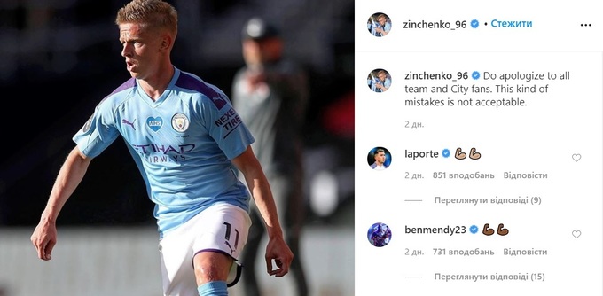 Зінченко попросив вибачення у вболівальників і партнерами в Instagram, Менді і ще кілька футболістів "містян" оцінили цей вчинок.