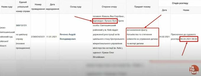 З приводу "обліко морале" пана Лучі. Зараз у нього інші турботи, оскільки 5 квітня його самого чекає суд. Причому, він буде виступати в якості відповідача. Ця інформація з судових інстанцій нашої країни є у відкритому доступі. У Святошинському суді міста Києва позивач – Яна Коваль. Справа дуже делікатна – встановлення факту батьківства і стягнення аліментів для забезпечення дитини,