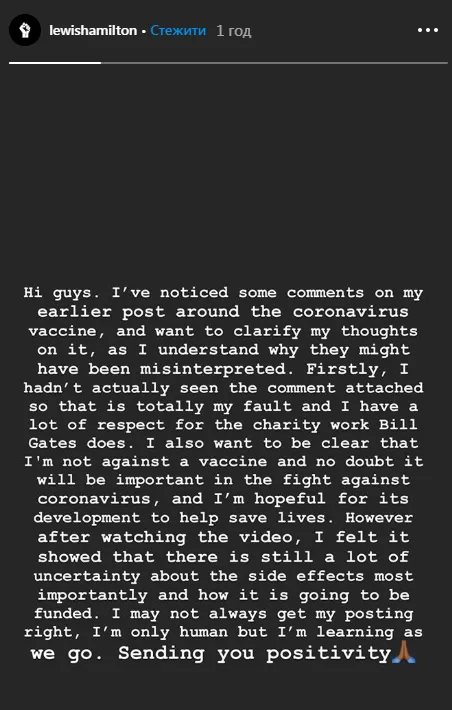 Таке повідомлення на сторінці Хемілтона викликало шквал критики в його прихильників. Вони звинуватили його у поширенні ідей проти вакцинації. Тож після цього Хемілтон виступив з вибаченням. І поясненням.
