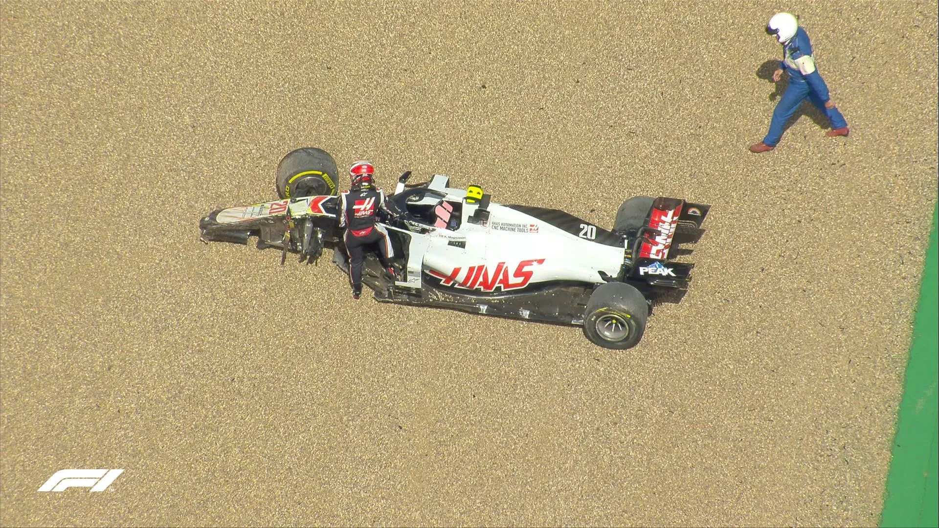 І вже на першому колі сталася аварії, через що на трасу виїхали машини безпеки. В останньому повороті Алекс Албон зіштовхнувся з Кевіном Магнуссеном. Болід Haas викинуло на обочину, після чого відбулося зіткнення з відбійниками. Згодом пілота Red Bull оштрафують за це на 5 секунд.