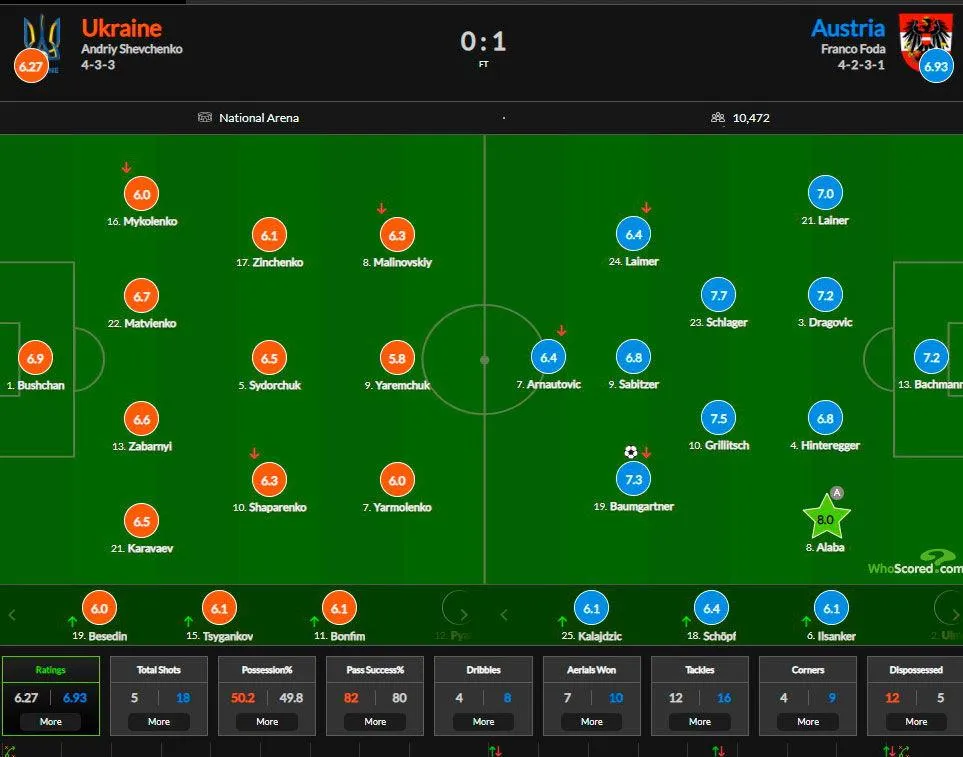 - Збірна України завершила виступ на груповому етапі поразкою Австрії (1:0). За весь матч наші гравці завдали всього 5 ударів проти 18 в Австрії.