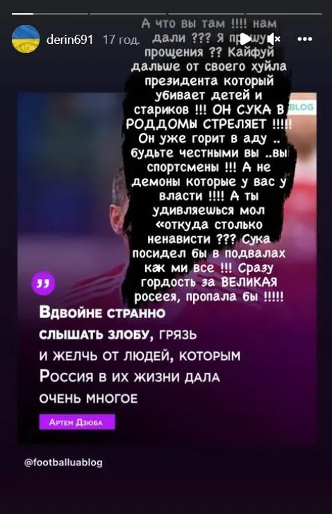 А що ви нам дали? Кайфуй далі від свого ху**а-президента, який вбиває дітей і літніх людей. Він, с**а, по пологових будинках стріляє. Він уже горить в пеклі. Будьте чесними. Ви спортсмени, а не демони, які у вас при владі. А ти дивуєшся, мов, звідки стільки ненависті. С**а, посидів би ти у підвалах, як ми всі. Одразу гордість за вєлікую расєю зникла би,