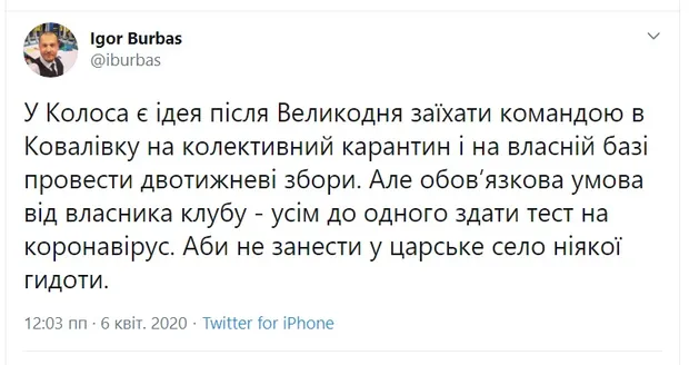 За його інформацією, гравці повинні здати тести на коронавірус, після чого "Колос" планує влаштувати колективний карантин на власній тренувальній базі.