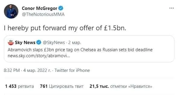 МакГрегор прикріпив до свого повідомлення в твітері посилання, в якому йдеться про готовність Абрамовича до продажу Челсі за 3 мільярди фунтів стерлінгів.