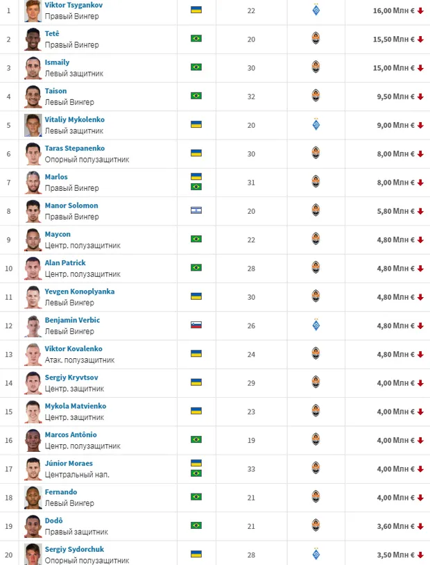 Найдорожчим гравцем УПЛ залишився півзахисник київського "Динамо" Віктор Циганков. Його ціна відтепер становить 16 млн євро (що на 4 млн менше, ніж раніше).