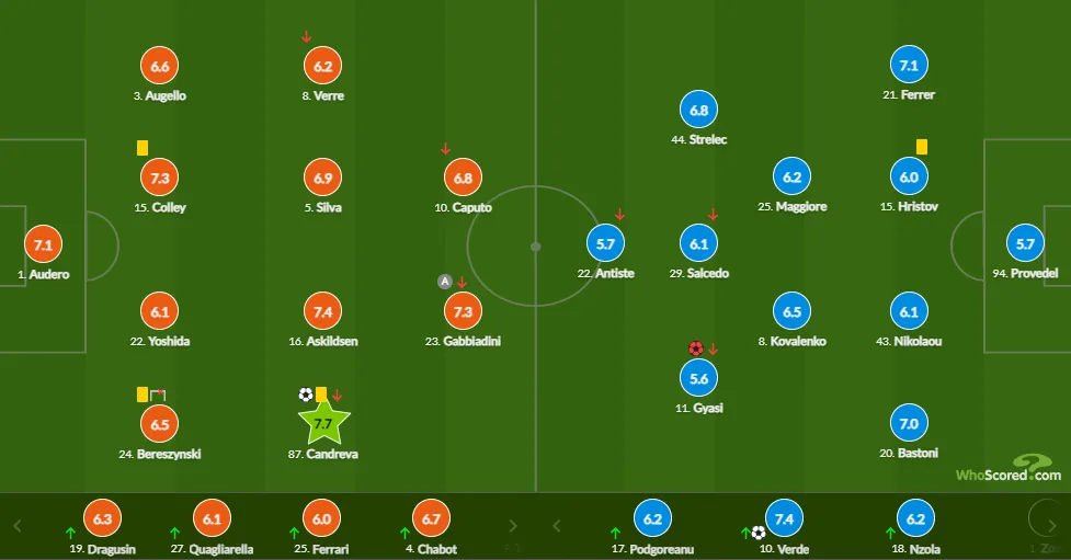 Відзначимо, що чудово в поєдинку зіграв півзахисник Сампдорії Антоніо Кандрева, за що отримав від порталу звання гравця матчу (7.7).