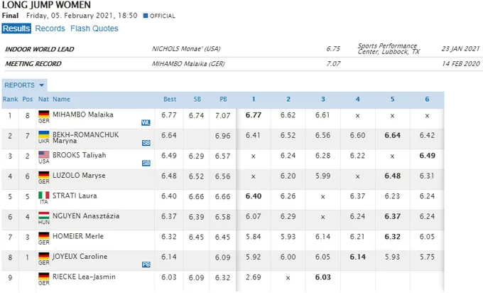 Представниця Німеччини ж впевнено захопила лідерство вже зі старту. Але до четвертої спроби Міхамбо не вдалось покращити свої цифри, які вона поставила у першій спробі – 6.77.