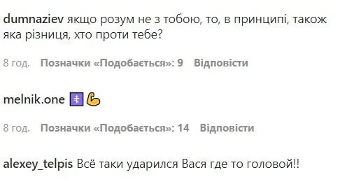 - "Яке може бути духовне єднання з народом варварів і дегенератів, які виправдовують насилля над людьми заради "руського міра". Василь, скажіть чесно за кого ви у цій війні і висловіть нарешті вже свою думку на рахунок подій, що відбуваються зараз"