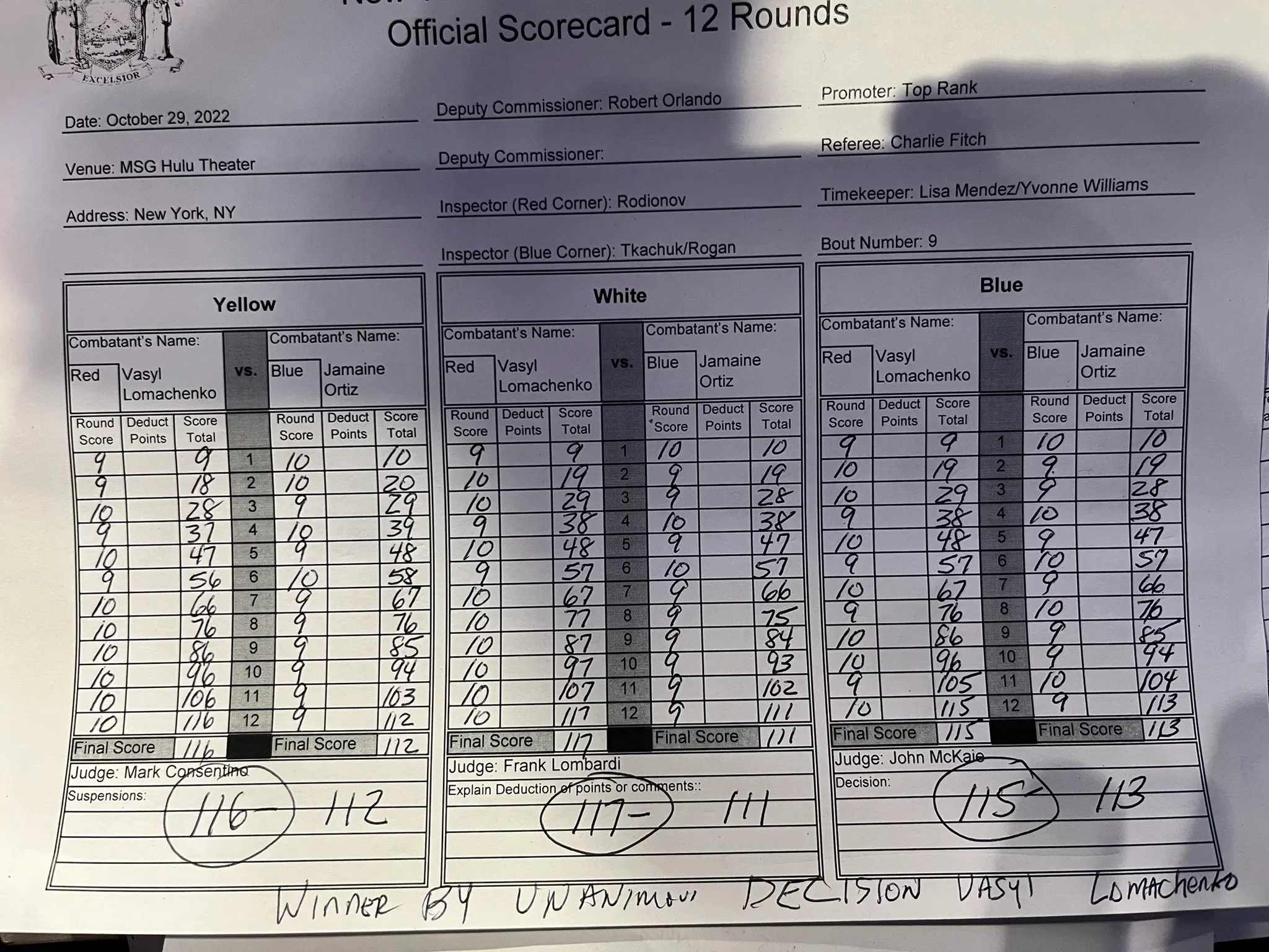 Це підтвердили й судді. Після закінчення бою Ломаченко переміг одноголосним рішенням суддів 115:113, 116:112, 117:111. Усі судді віддали Ортісу лише перший, четвертий та шостий раунди.
