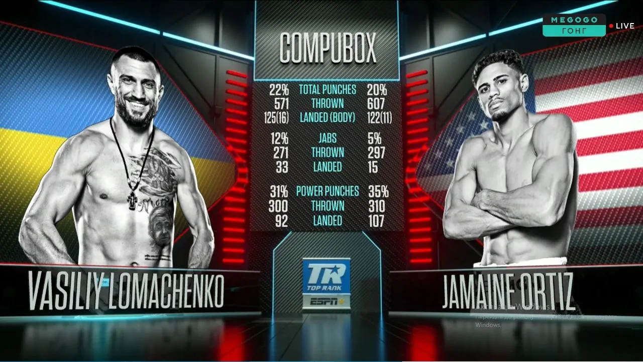 А от система Compubox значної переваги з боку Ломаченка не помітила. За цією статистикою, Ломаченко загалом за бій завдав менше ударів, аніж його суперник – 571 проти 607. Але українець був влучнішим – 125 проти 122. Тож і у відсотковому значенні Ломаченко був кращим за Ортіса – 22% влучних ударів проти 20% в американця.