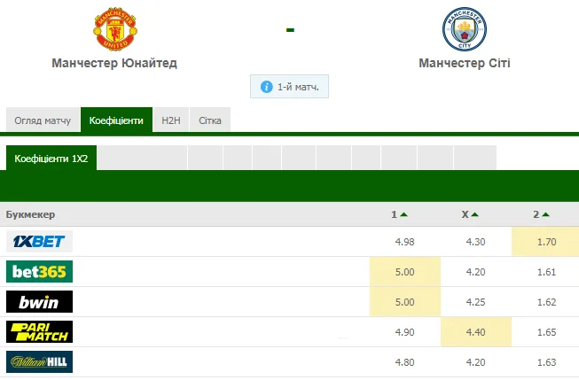 І саме перемогу "МанСіті" очікують букмекери у матчі на "Олд Траффорд". Команда Пепа Гвардіоли зараз виглядає краще за суперників. Хоча в чемпіонаті Англії саме МЮ неочікувано завдав поразки конкуренту в дербі, так ще й на їх полі.