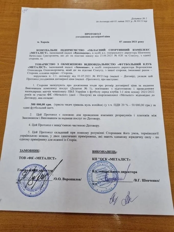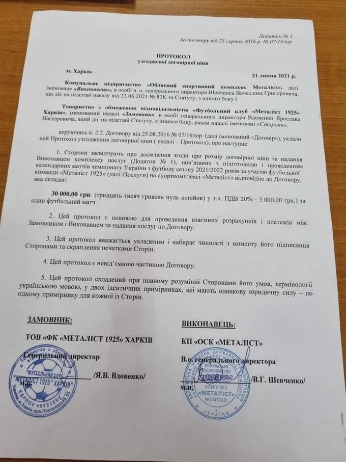 Фото документів, що містять ціну оренди стадіону "Металіст":