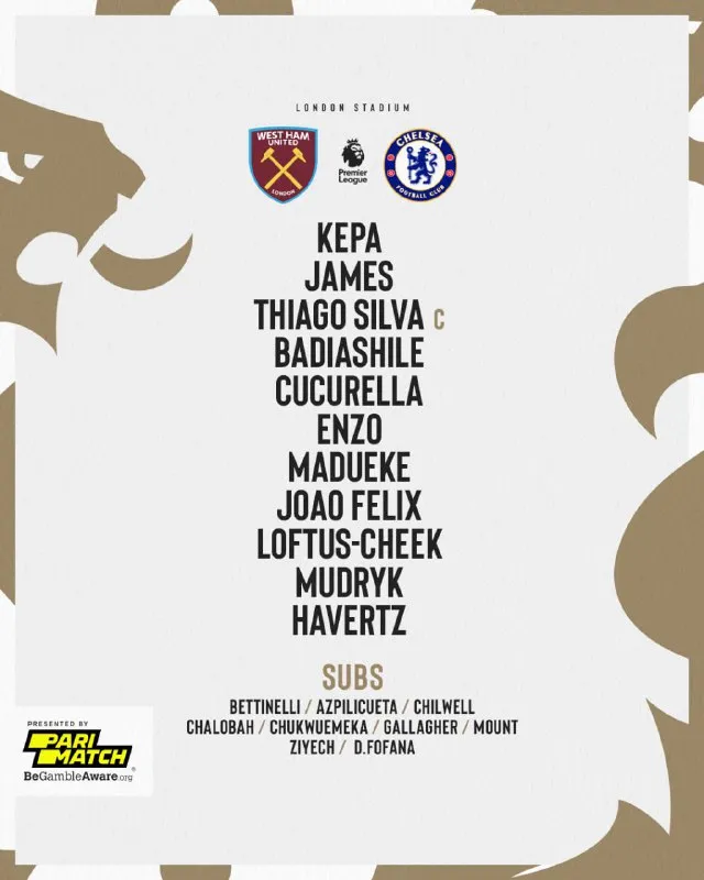 - Склад Челсі: Кепа Аррісабалага, Джеймс, Бадьяшиль, Сілва, Кукурелья, Фернандес, Лофтус-Чік, Мадуеке, Мудрик, Хаверц, Фелікс