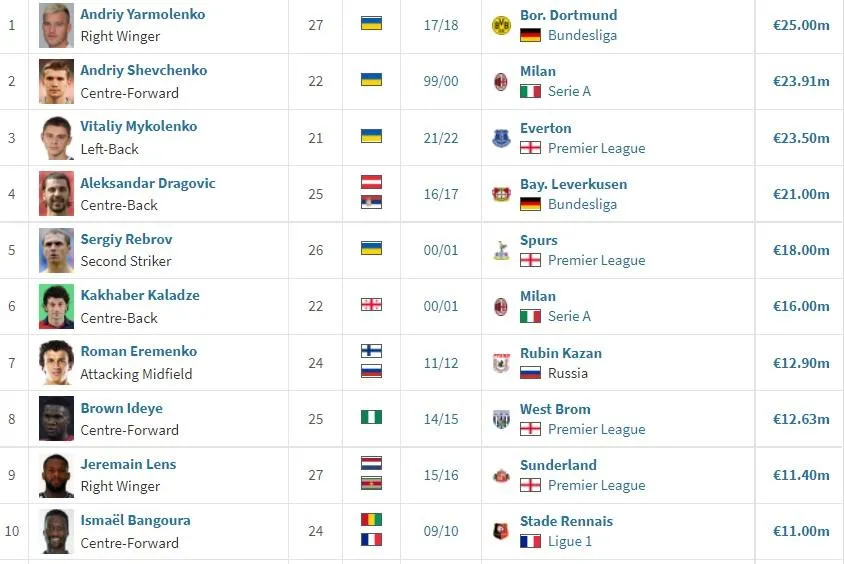 1. Андрій Ярмоленко (25 мільйонів євро)