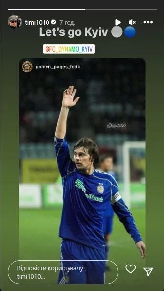 На фотографії Артем Мілевський у формі Динамо з капітанською пов'язкою. Таким чином, ексфорвард підтримав свій рідний клуб напередодні Всеукраїнського дербі.