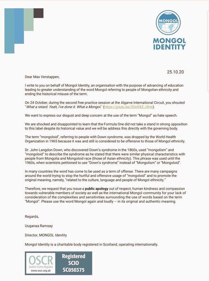 Організація "Монгольська ідентичність", яка бореться за припинення історично прийнятого негативного вживання терміна "монгол", зажадала вибачень від Ферстаппена, назвавши подію "огидним" інцидентом.