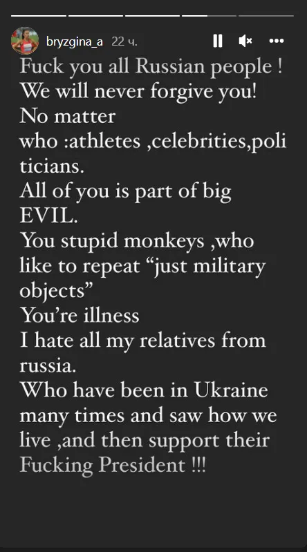 Нах*й всіх росіян. Ми вам ніколи не пробачимо. Неважливо хто: спортсмени, знаменитості, політики. Всі ви є частиною великого зла,