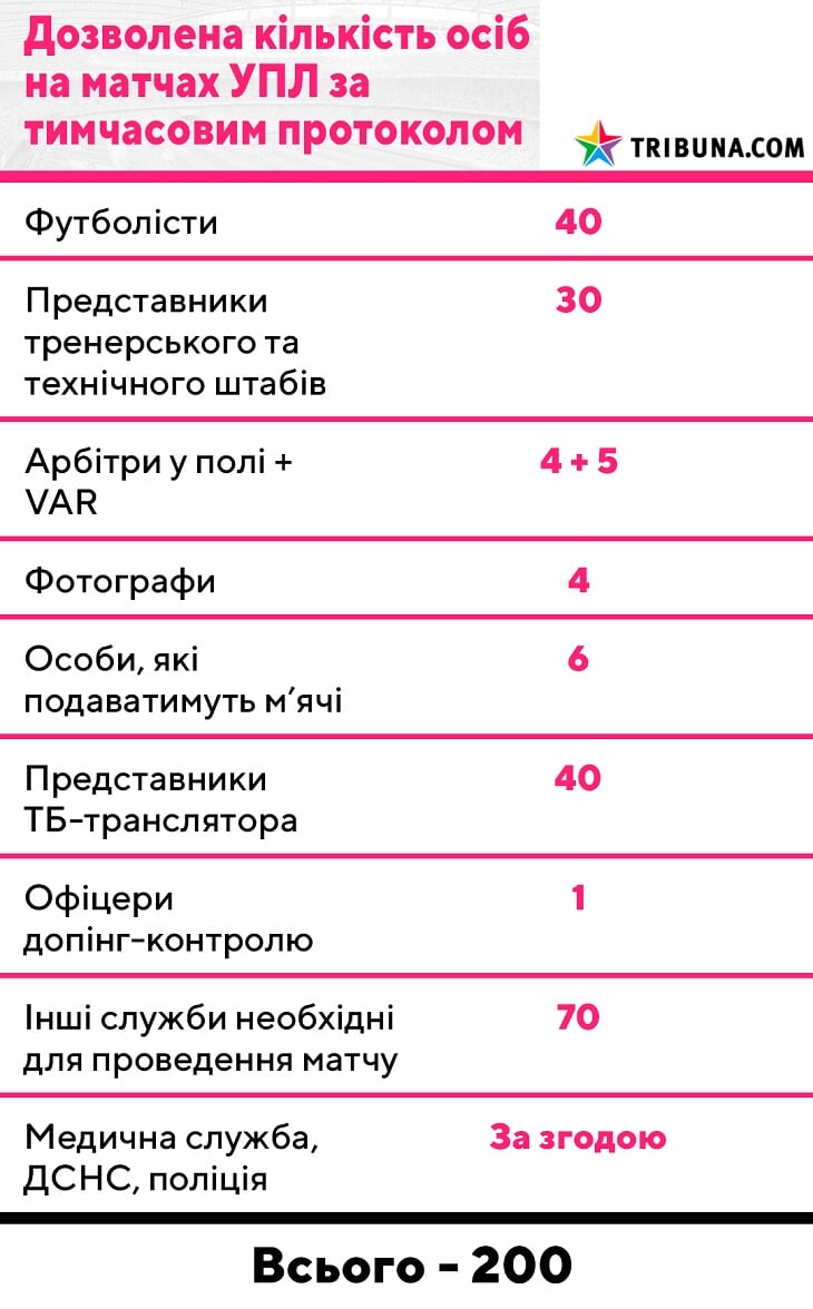 - Одночасно по всій території арени можуть перебувати не більше 200 осіб. Віце-президент УАФ Вадим Костюченко уточнив, що на стадіоні не буде батьків, інших родичів, дружин гравців, а тільки особи потрібні для проведення матчу. В усіх працівників мають бути засоби індивідуального захисту – маски, респіратори, рукавички.
