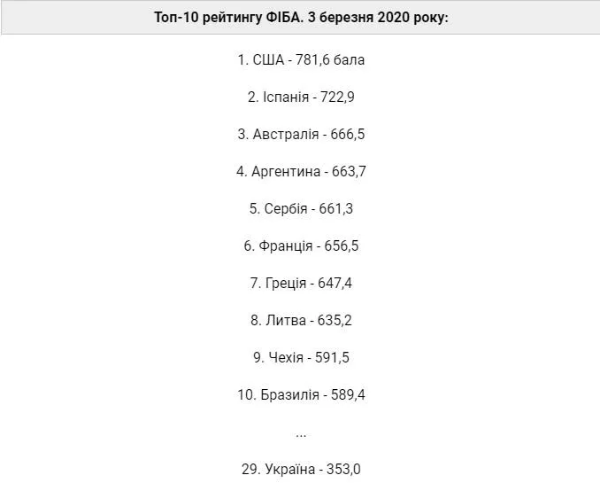 Рейтинг очолює команда США, на другій сходинці розташувалась збірна Іспанії, третя – Австралія.