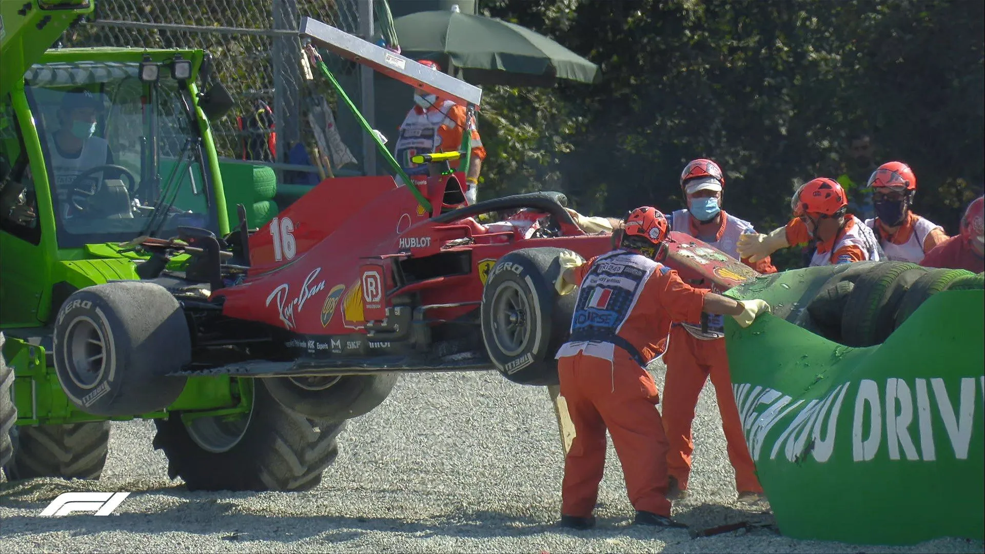 - Після аварії Леклера гонку вимушено зупинили, щоб прибрати болід гонщика та відновити розбиті бар'єри. Гран-прі відновилося о 17:20 за київським часом.