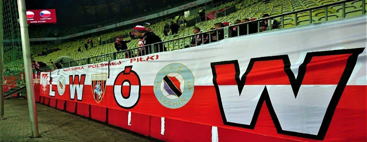 На банері на тлі польського прапора величезними буквами нанесено напис Lwów, а вище – Kolebla polskiej piłki (колиска польського футболу).