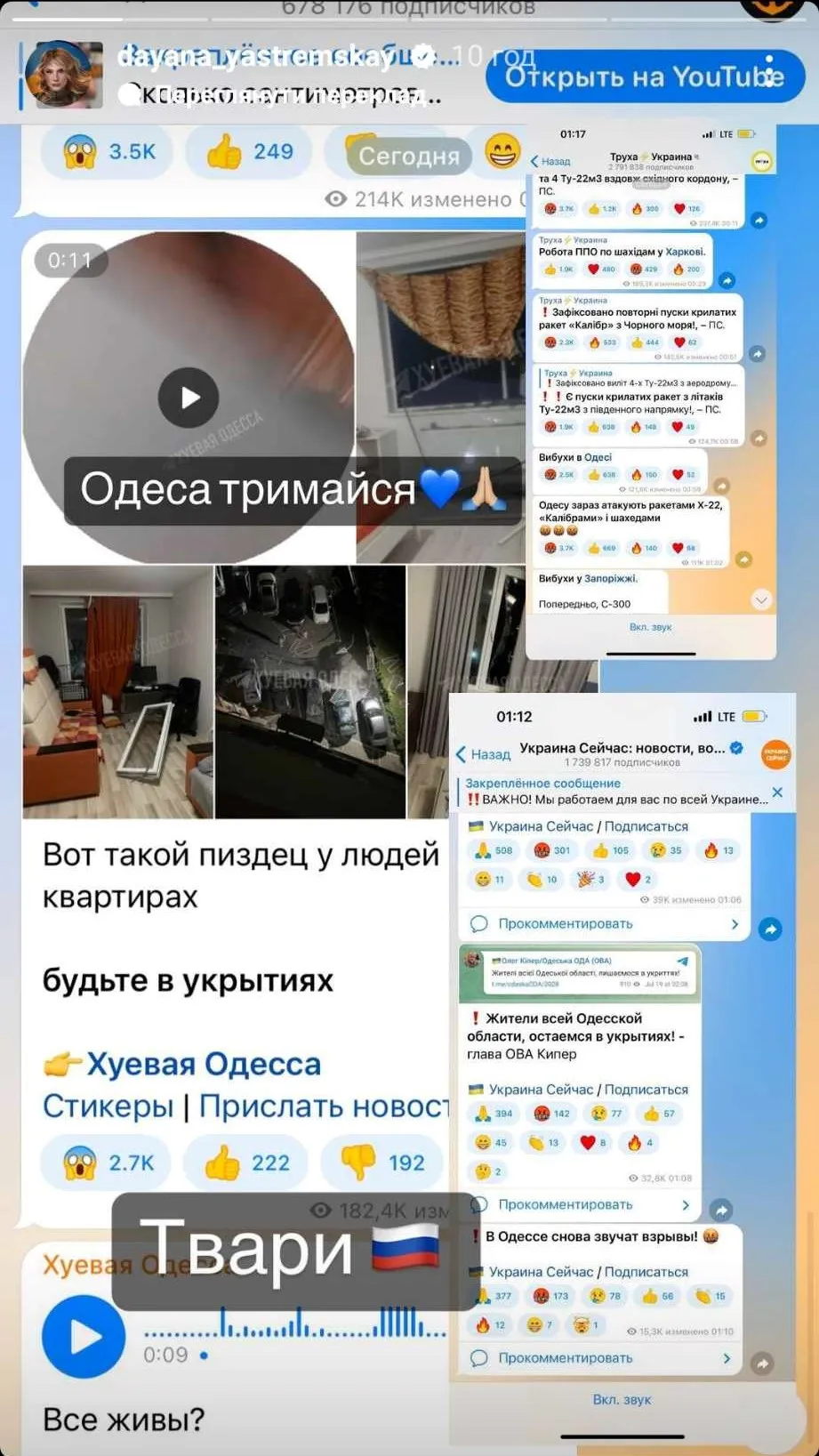 Даяна Ястремська опублікувала в себе в сторіс інстаграм скріншоти наслідків ракетного удару по Одеській області 19 липня. Також вона опублікувала запис розмови під час ракетного удару.