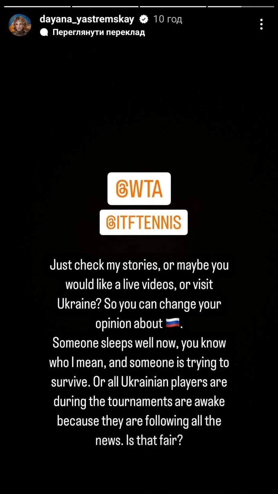 "WTA та ITF, подивіться мої сторіс чи, можливо, ви хочете побачити відео, або відвідати Україну? Так що ви можете змінити свою думку про Росію. Хтось зараз дуже добре спить, ви знаєте кого я маю на увазі, а хто намагається вижити. І всі українські тенісисти під час турнірів не сплять, адже стежать за новинами. Це чесно?" – написала Ястремська.