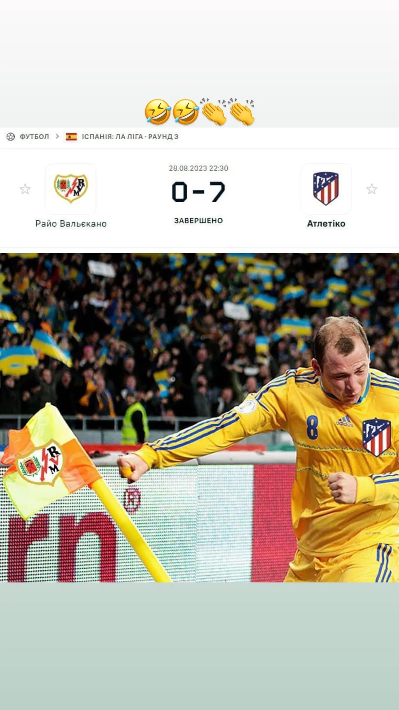Ексфорвард збірної України опублікував у своєму Instagram результат поєдинку та додав смайлики. Очевидно, що побиття Райо Вальєкано дуже потішило Зозулю.