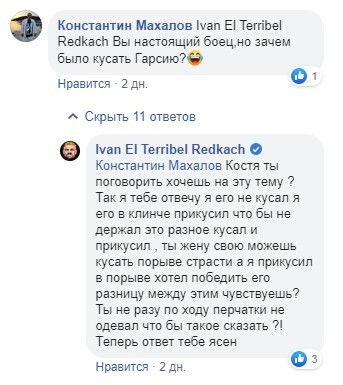 Поговорити хочеш на цю тему? Так я тобі відповім. Я його не кусав. Я його в клінчі прикусив, щоб не тримав. Це різне: кусав і прикусив. Ти дружину свою можеш кусати в пориві пристрасті, а я прикусив в пориві, хотів перемогти його. Різницю між цим відчуваєш? Ти жодного разу по ходу рукавички не одягав, щоб таке сказати? Тепер відповідь тобі зрозуміла,