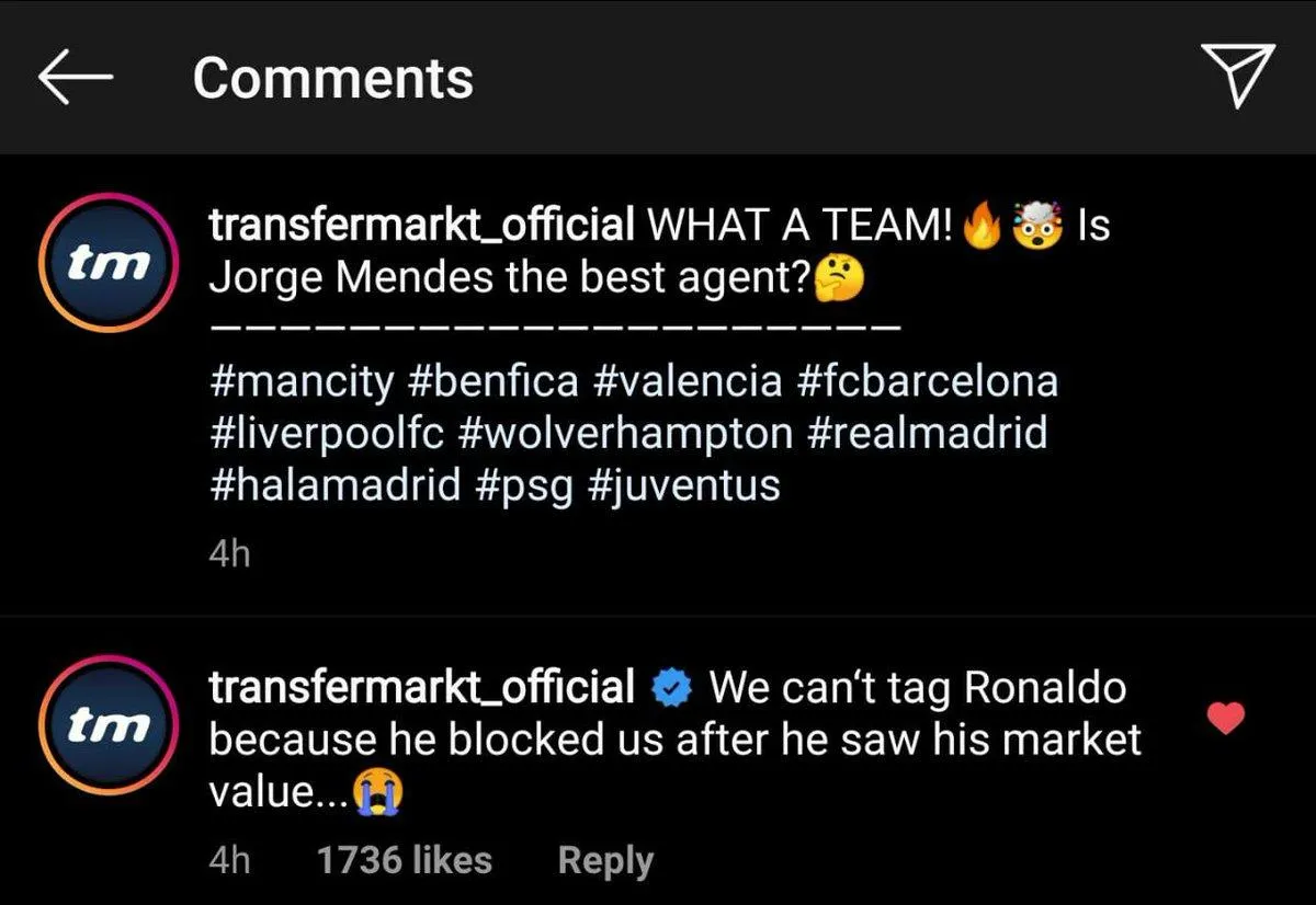Ми не змогли тегнути Роналду, тому що він заблокував нас, коли побачив свою вартість, – прокоментував цю ситуацію Transfemarkt у коментарях.