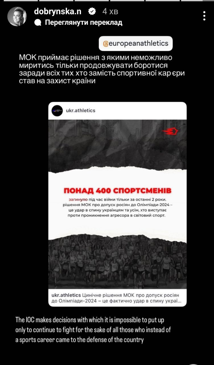 Дещо пізніше за Жана свою реакцію на дане рішення МОК залишили колишні українські легкоатлетки Наталія Добринська та Ольга Саладуха. Обидві ексспортсменки поширили публікацію, де показана цифра атлетів, які загинули під час повномасштабного вторгнення Росії в Україну.
