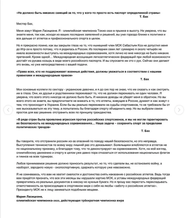 Російська легкоатлетка Марія Ласіцкене, яка спеціалізується на стрибках у висоту, у своєму інстаграмі написала відкритого листа очільнику МОК. Вона звинуватила його через непослідовність дій, пов'язаних з санкціями відносно усього російського спорту та звинуватила у боягузтві через відмову їх скасувати.