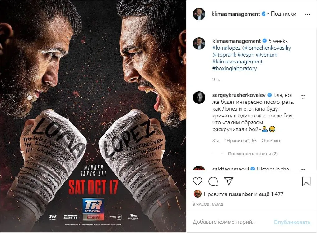 Колишній чемпіон світу в напівважкій вазі Ковальов прокоментував дії сімейства Лопесів в інстаграмі. Відповідний коментар він залишив на сторінці свого менеджера Егіса Клімаса.
