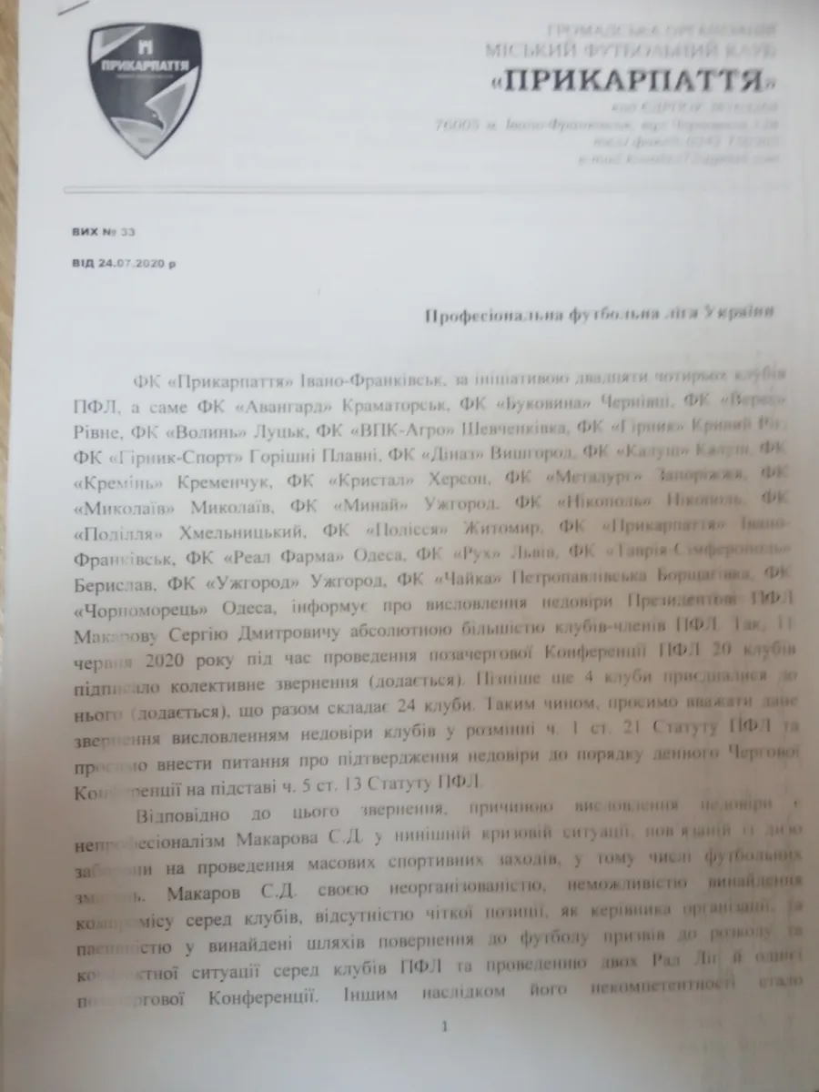 11 июня 20 клубов подписали коллективное обращение о выражении недоверия Макарову. Позже к нему присоединились еще четыре клуба. Об этом сообщает сайт "Прикарпатья".